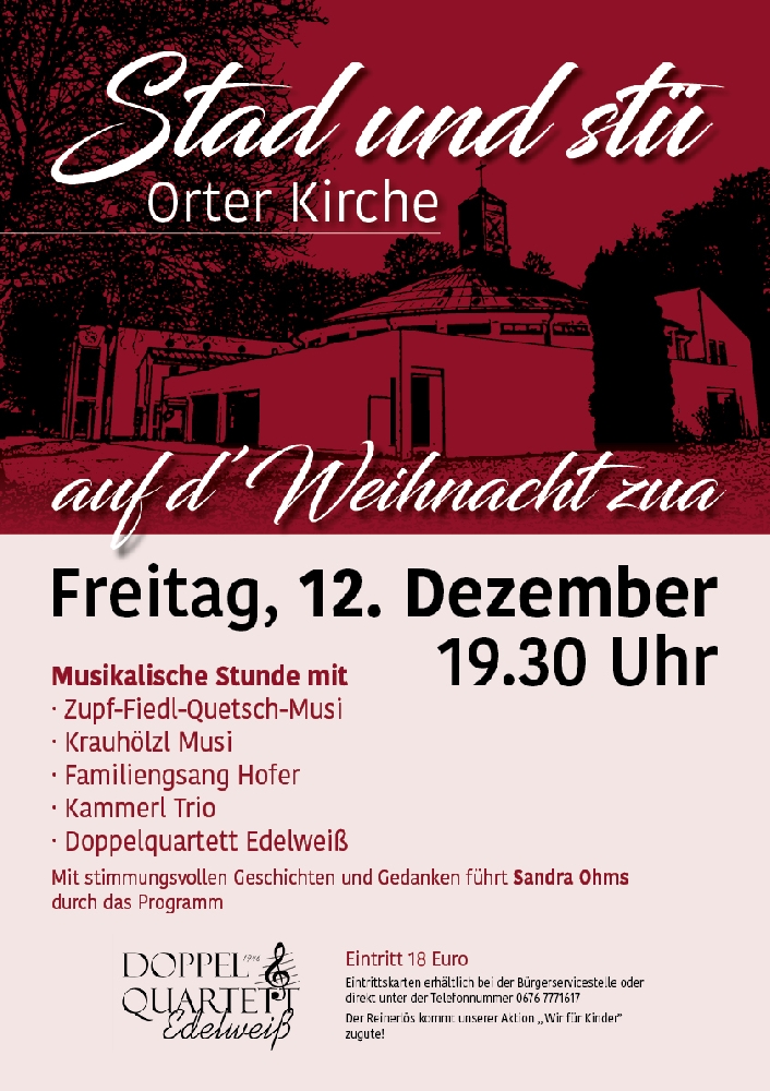 ![]() | Stad und stü auf d´Weihnacht zuaWANN: 12.12.2025, 19:30WO: Filialkirche Gmunden OrtLiebe Freunde unseres Adventsingens!Mit großer Vorfreude dürfen wir unser Adventsingen "Stad und stü auf d´Weihnocht zua" in der Orter Kirche ankündigen. Nähere Informationen folgen! Euer Doppelquartett Edelweiß! |
